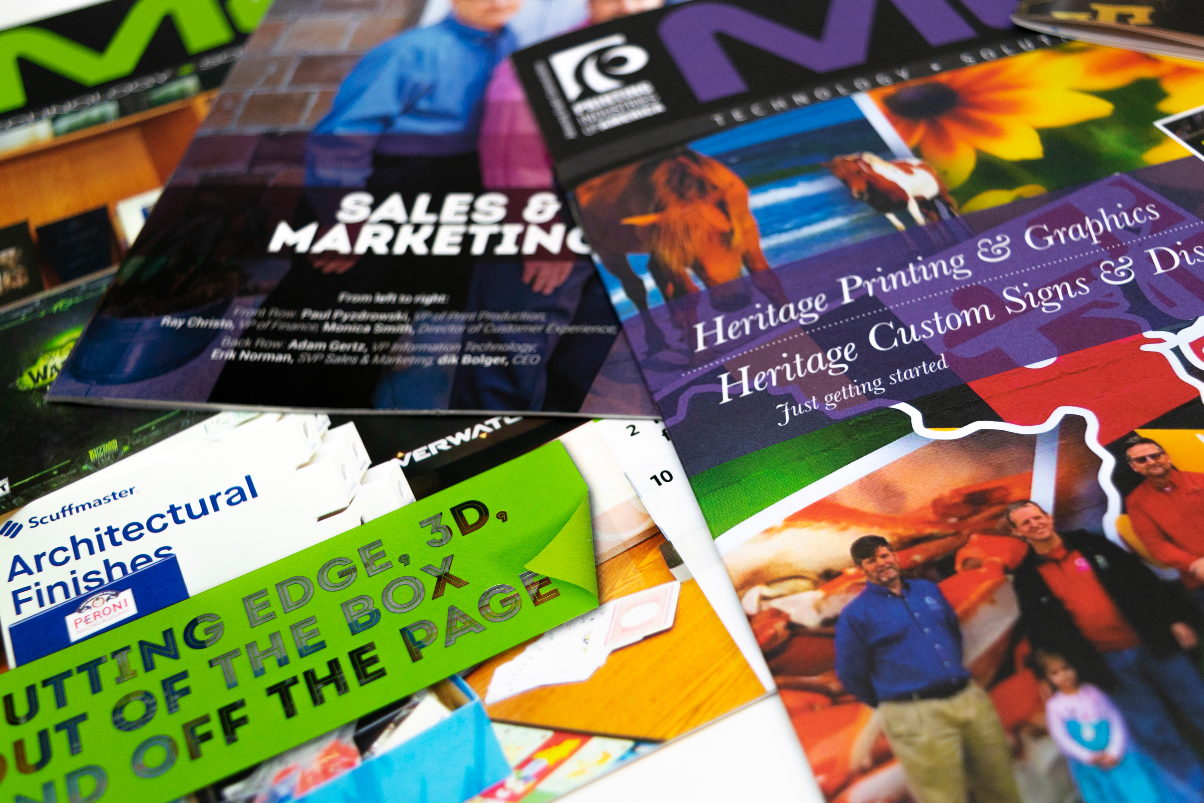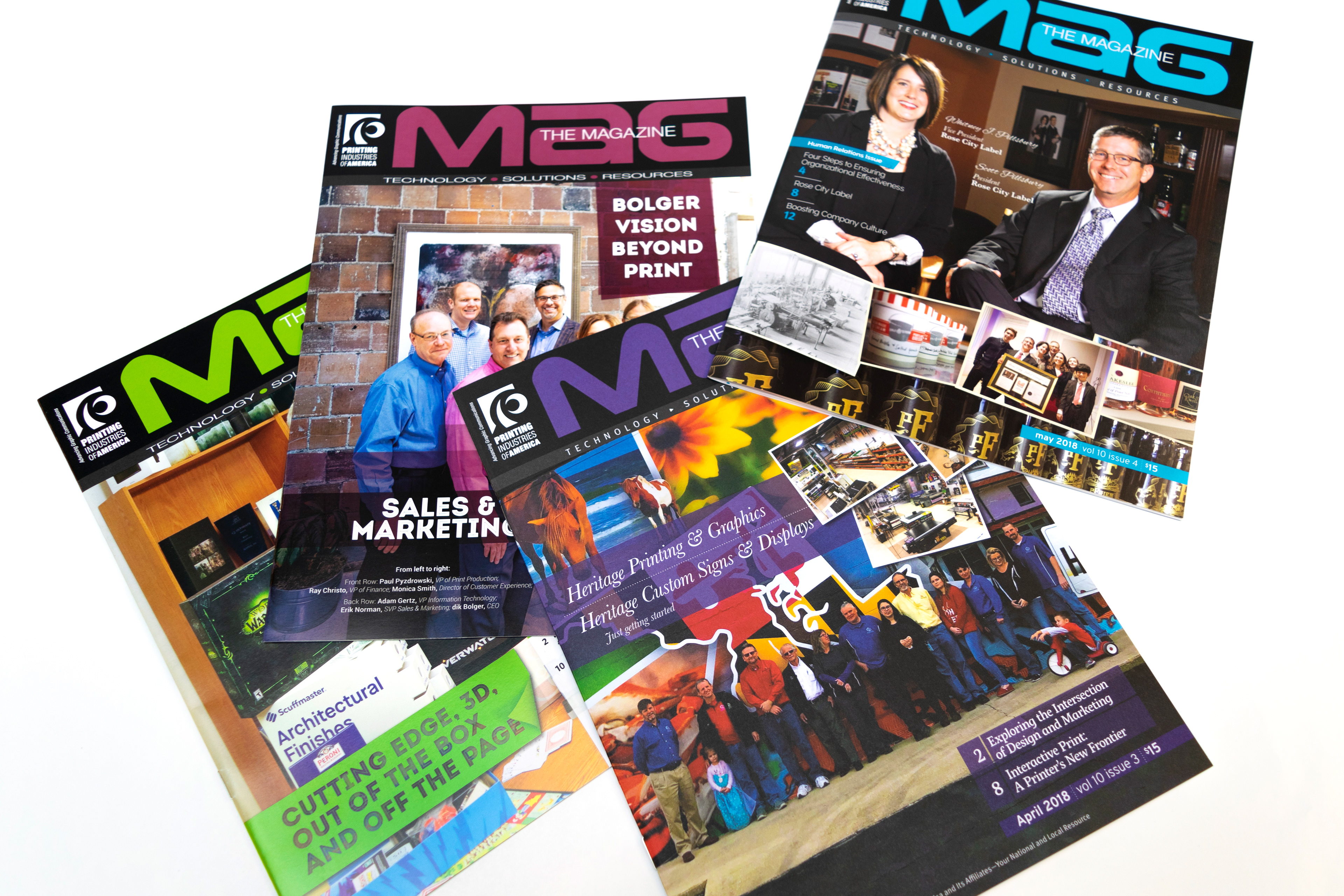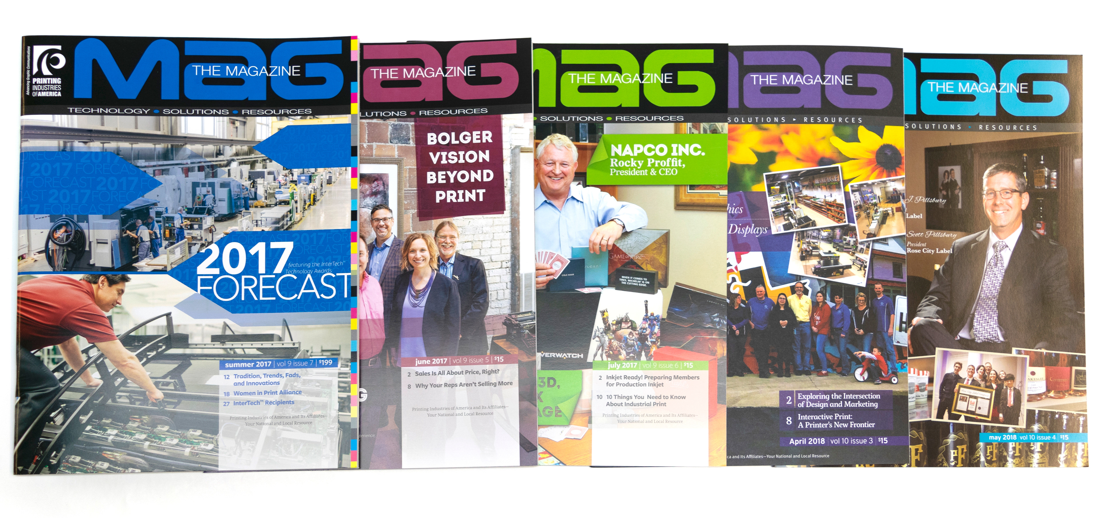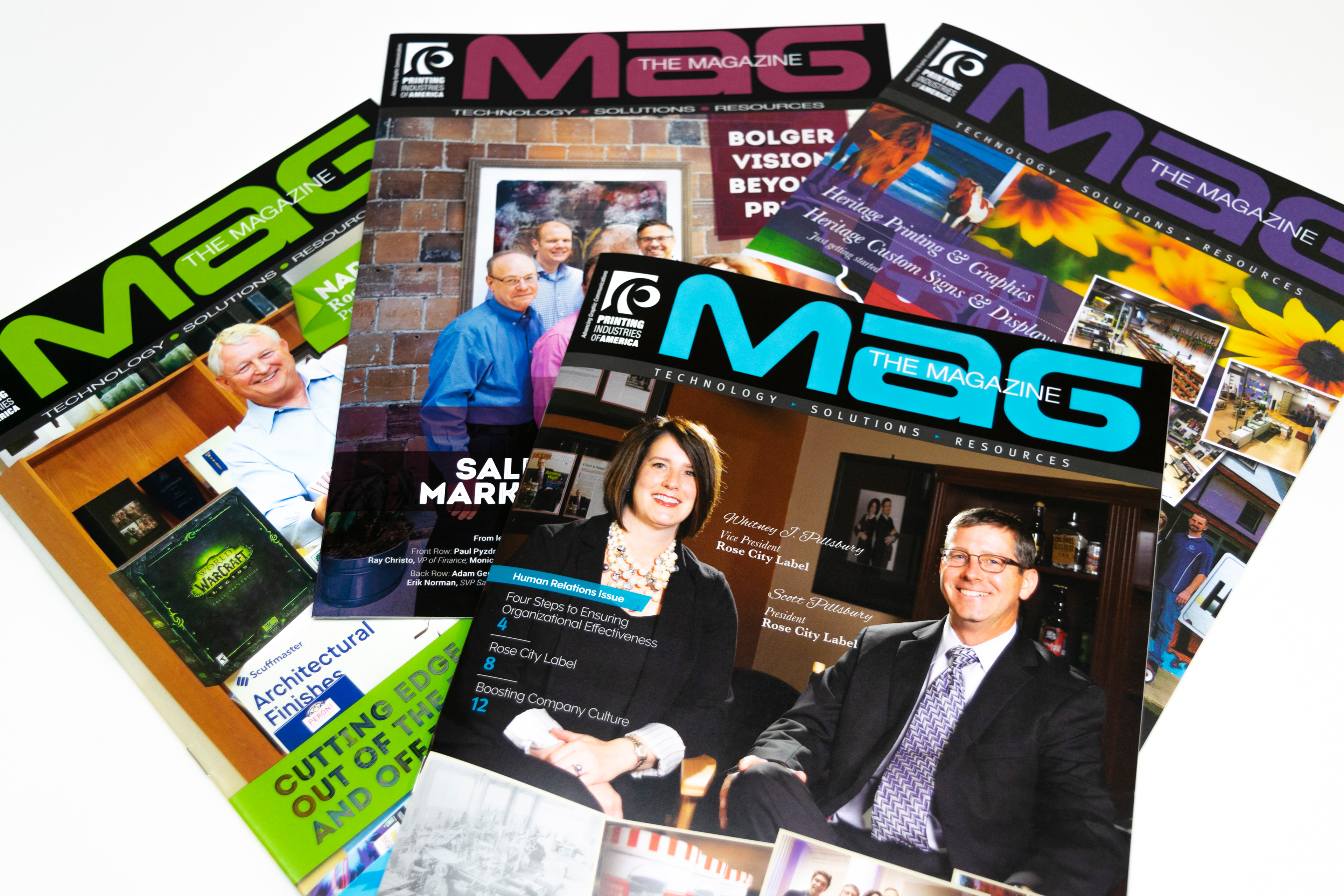 The Printing Industries of America: The Magazine is monthly magazine sent to the membership of Printing Industries of America (PIA). The magazine features a member profile, typically focusing on print production and printing techniques, and offers a small glimpse into the new production styles of modern printing operations. The Magazine has been through many design iterations, and currently pushes color and typography through design, bringing readers closer to the subject matter more than ever before. The copy font changed from Condensed Franklin Gothic to Mrs Eaves XL Narrow for easier readability and legibility. We have only positive feedback in regards to the switch, and readership has increased by 15% yearly.